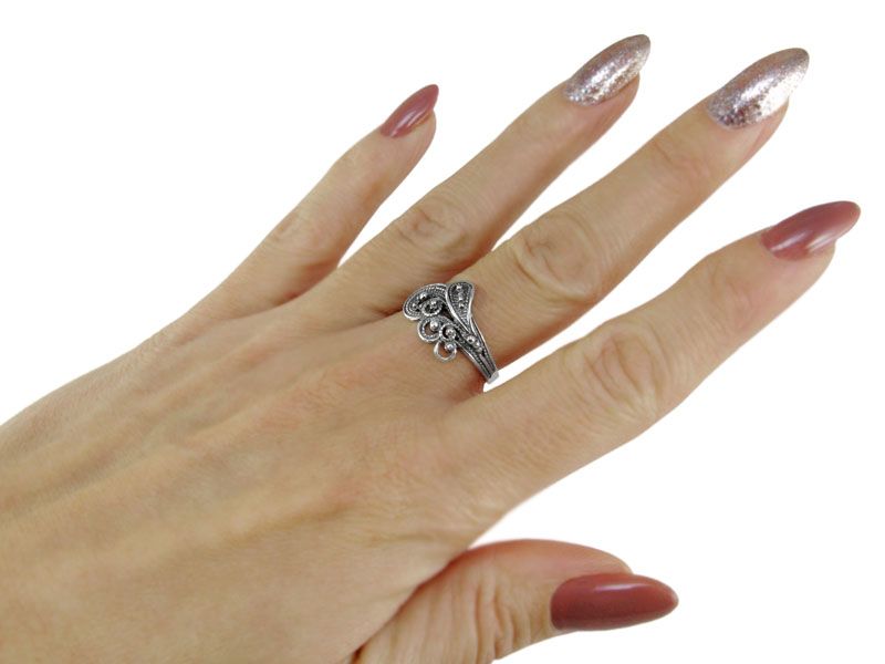 Кольцо из серебра «Барашек» - напоминание Вам, дорогие ценительницы прекрасного, о традициях ювелиров. В основе узора серебряного кольца – сложнейшая ручная техника филиграни. Материалом для филигранных изделий является витая (реже гладкая) проволока, из которой выгибаются мелкие детали узоров. Считается, что создание ювелирных украшений с филигранью – это наивысшее мастерство ювелира!