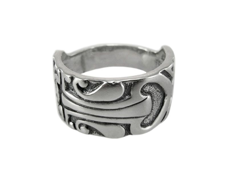 Серебряное кольцо «Майя» широкое и необычное. Верхняя часть более широкая, нижняя немного уже. Это было сделано для того, чтобы кольцо лучше садилось на пальчик. На поверхности, в части узоров, использовано оксидирование – чернение. Именно чернение подчеркивает утонченность линий, графические приемы.