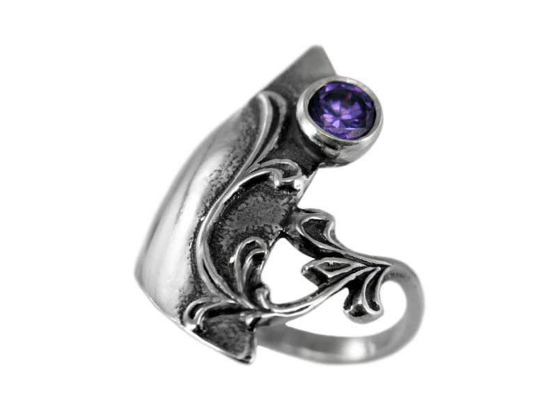 Прекрасный пример асимметрии – кольцо из серебра 925 пробы «Полевое». Кольцо словно делится на две части – одна тонкая, состоящая из узора, вторая – гладкая пластина, на которой продолжается узор. Кольцо декорировано ярким фианитом, который может быть голубого, красного или фиолетового цвета.