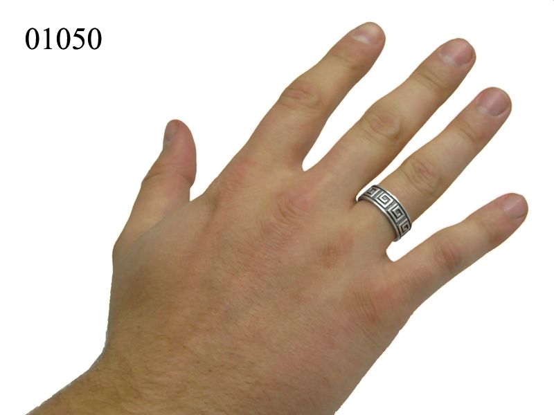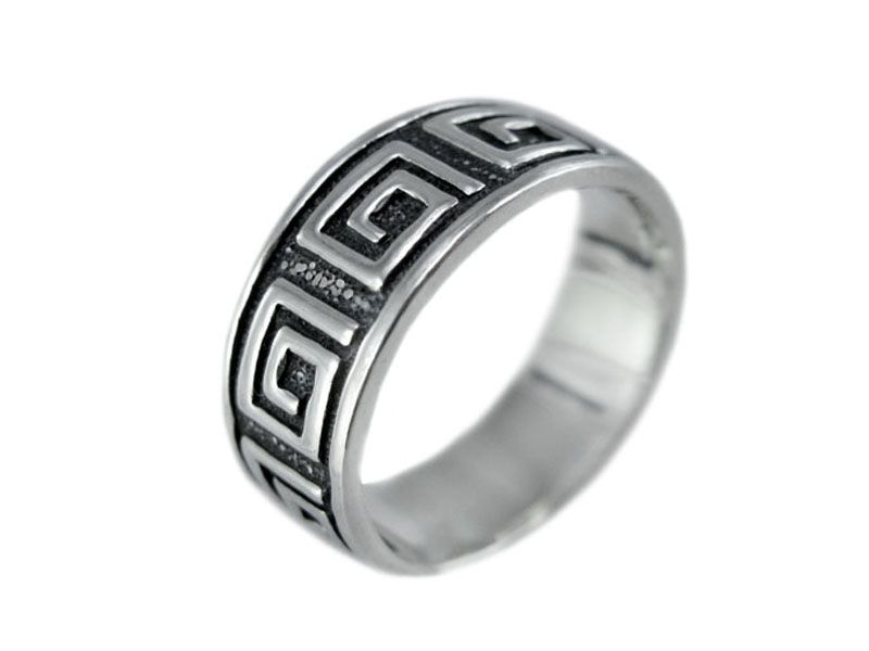 Кольцо серебряное мужское «Эллада» имеет форму «обручалки». В качестве принта – греческий узор, актуальный уже несколько сезонов. Использовано чернение.