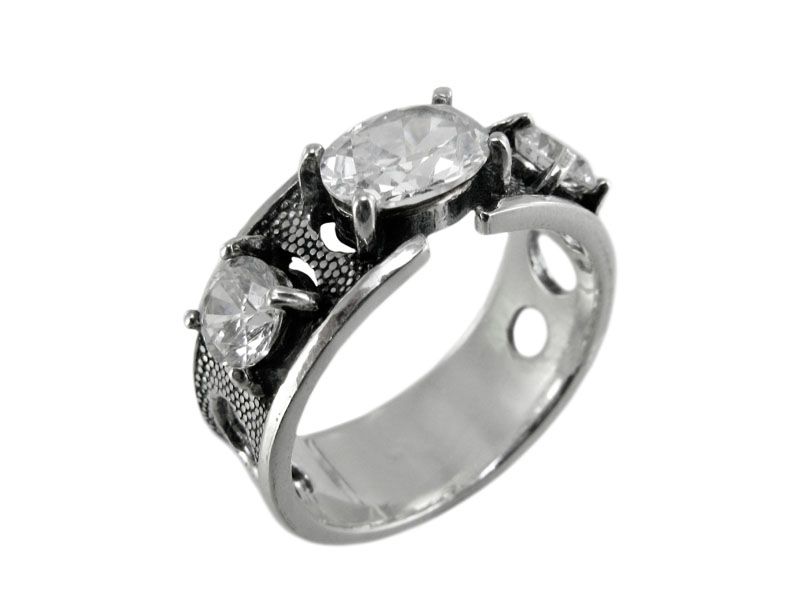 Простое кольцо в форме обручалки, но очень оригинального дизайна. Его декор - три крупных фианита черного или белого цвета и круглые прорези. Между камней серебро с оксидированной поверхностью.