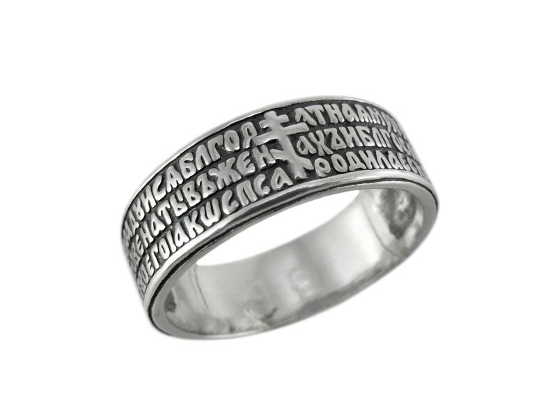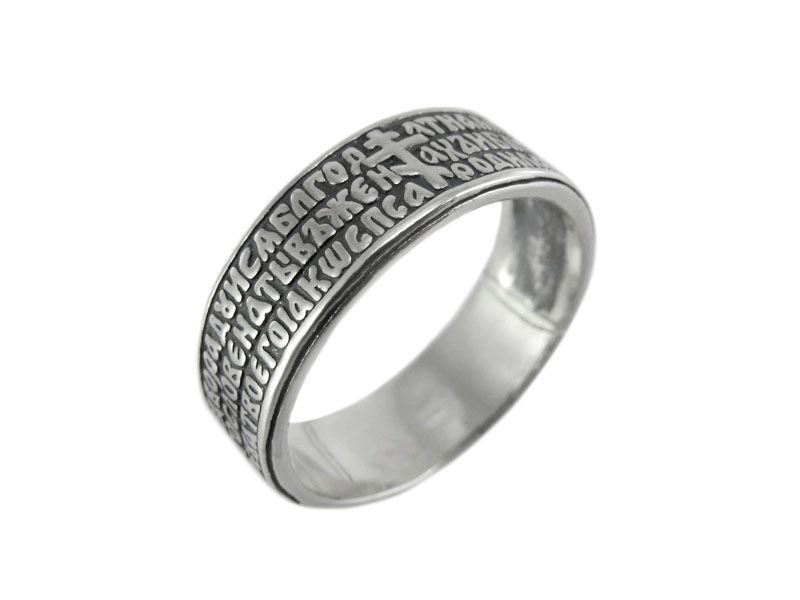 Кольцо из серебра, на котором полностью прописана молитва Богородицы. Центр кольца декорирован крестом.