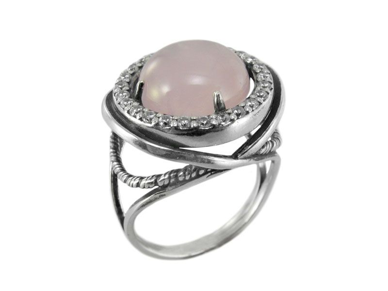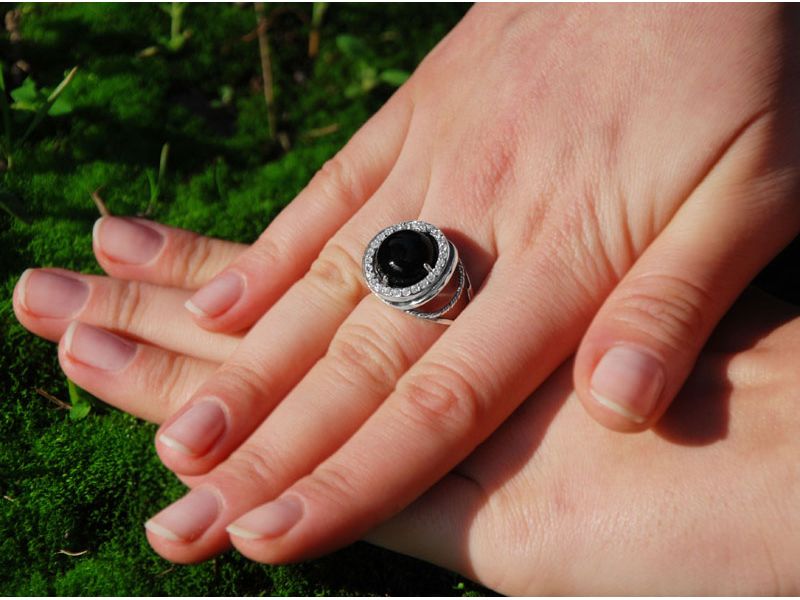 Серебряное кольцо «Гламур» состоит из основного круглого элемента, который возвышается над шинкой кольца на постаменте. В центре расположен натуральный круглый камень (кабошон), вокруг которого мелкие белые фианиты (кубический цирконий может быть белого, фиолетового или черного цвета).