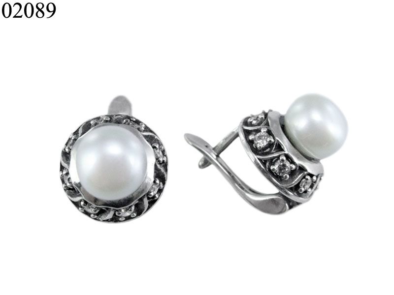 Серьги имеют круглую форму. В центре круга – белый культивированный жемчуг. По кругу на расстоянии нескольких миллиметров от центральной вставки расположены небольшие прозрачные камни – кубический цирконий. На каждой сережке 8 камней.