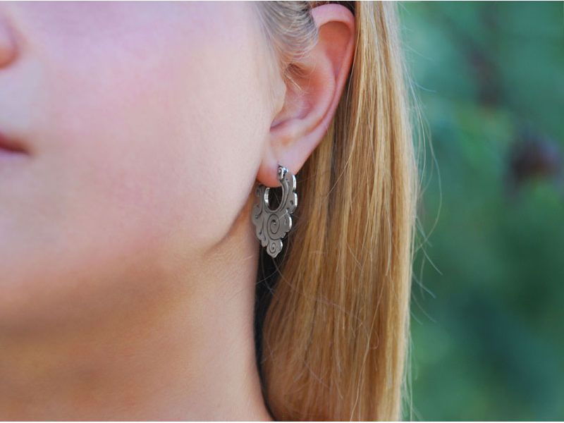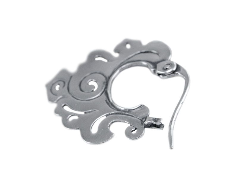 Серьги необычны не только благодаря своей форме (нестандартное расположение замка и основной части серьги), но и благодаря китайскому принту-орнаменту. Этот узор сегодня очень актуален, так как многие сейчас увлекаются азиатской культурой, путешествиями. Конечно, данный элемент орнамента не точная копия, а «фантазия на тему» нашего ювелира-модельера. Возможно, именно эти сережки из серебра пробудят в Вас тягу к приключениям…