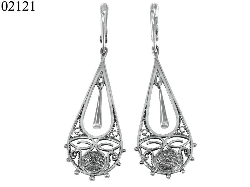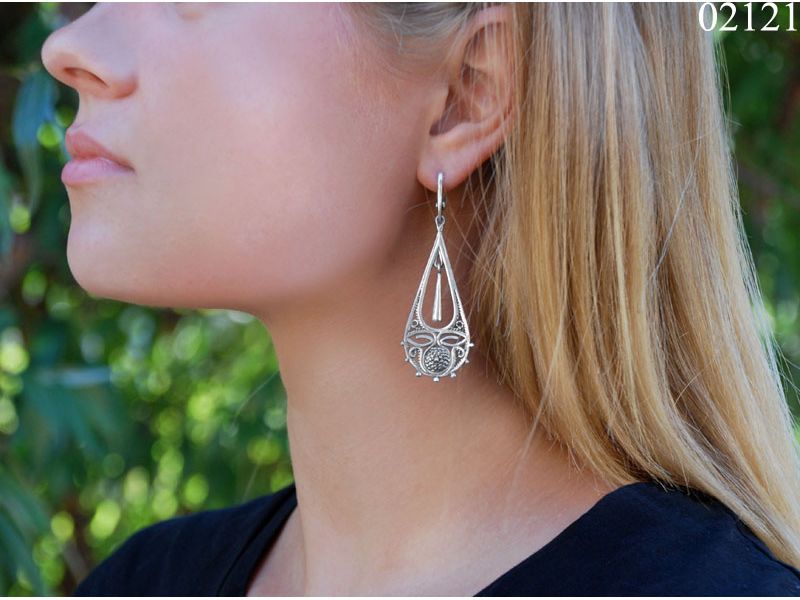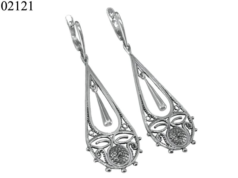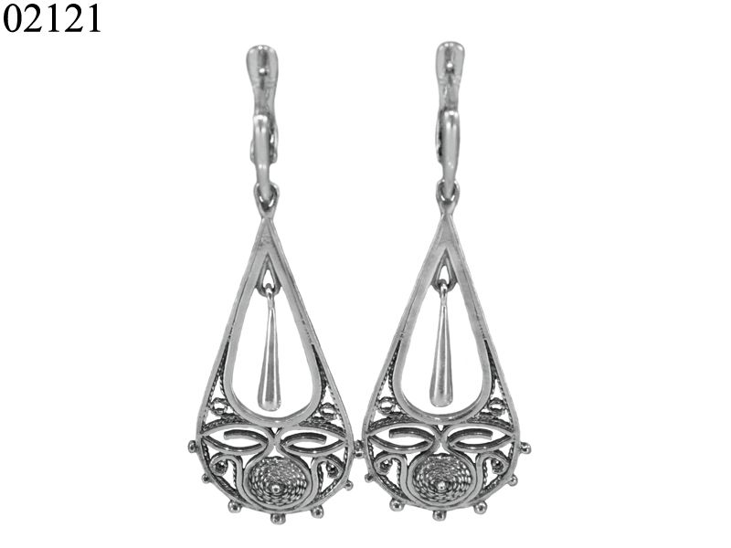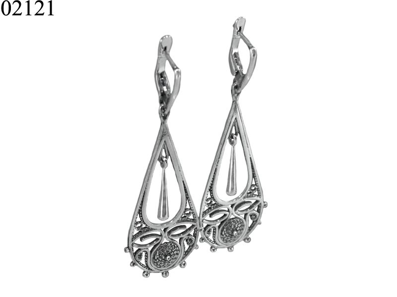 Сегодня мы хотим познакомить Вас с прекрасными сережками из серебра 925 пробы с чернением «Этно». В нашем каталоге уже есть крупные серьги с филигранью. Но нам этого было мало! Серьги «Этно» имеют каплевидную форму. Сережки состоят из трех элементов: утонченная верхушка-замок (классическая английская застежка), вытянутся капля, заполненная филигранью, а также маленькая гладенькая подвижная капелька, которая расположилась в центральной части сережки.