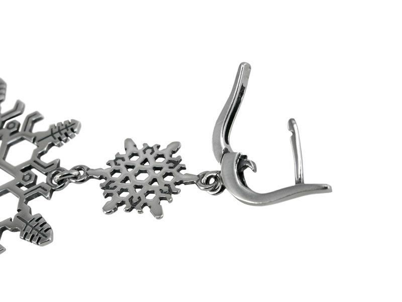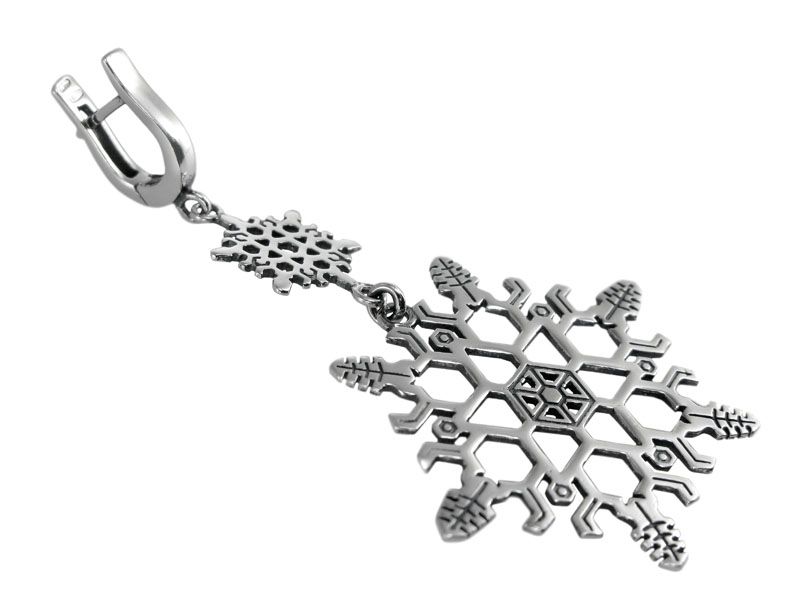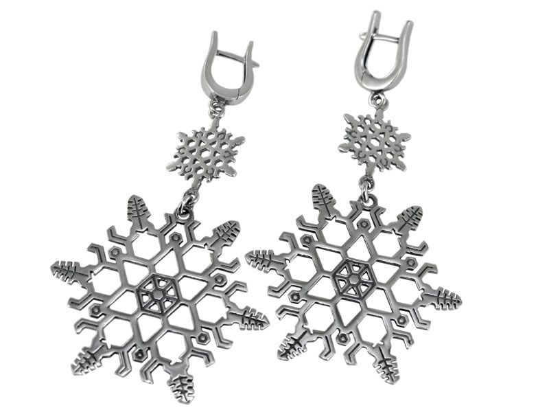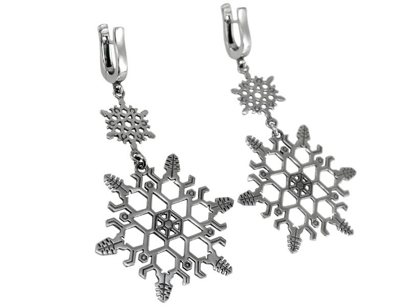 Серьги из серебра «Снежинка» состоят из трех элементов. Верхний – декоративная английская застежка. Средний – маленькая снежинка. Нижний – большая снежинка. Все три части крепятся друг к другу при помощи колечек, чтобы двигались между собой.