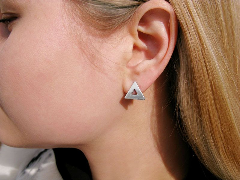 Новые удобные, лаконичные и невероятно стильные серебряные серьги «Треугольники». Эти украшения для ушек понравятся стильным девушкам, которые хотят выглядеть модно при любых обстоятельствах. Сережки имеют форму широких треугольников. Но главная особенность сережек в том, что сзади сережек вместо швензы точно такой же треугольник, что и спереди.