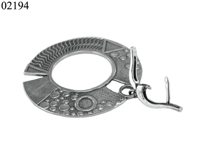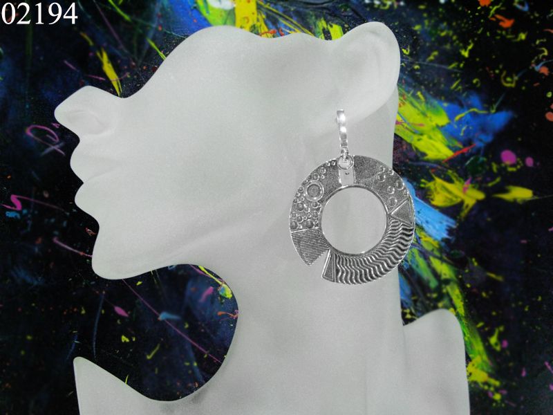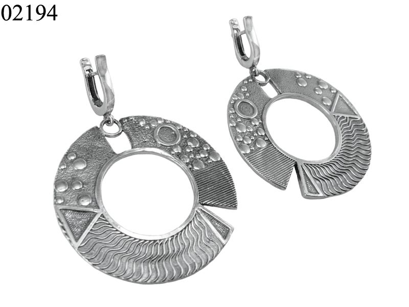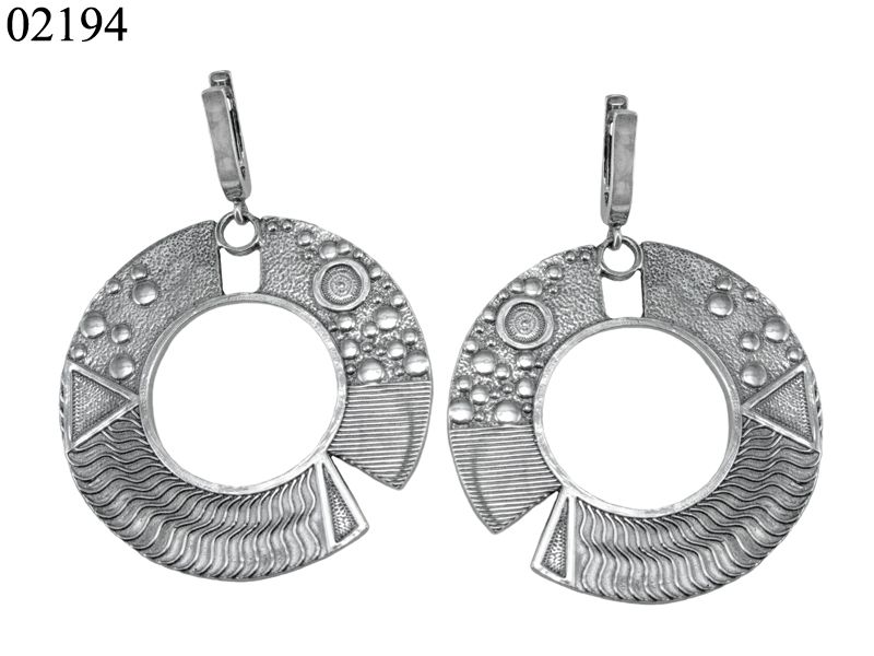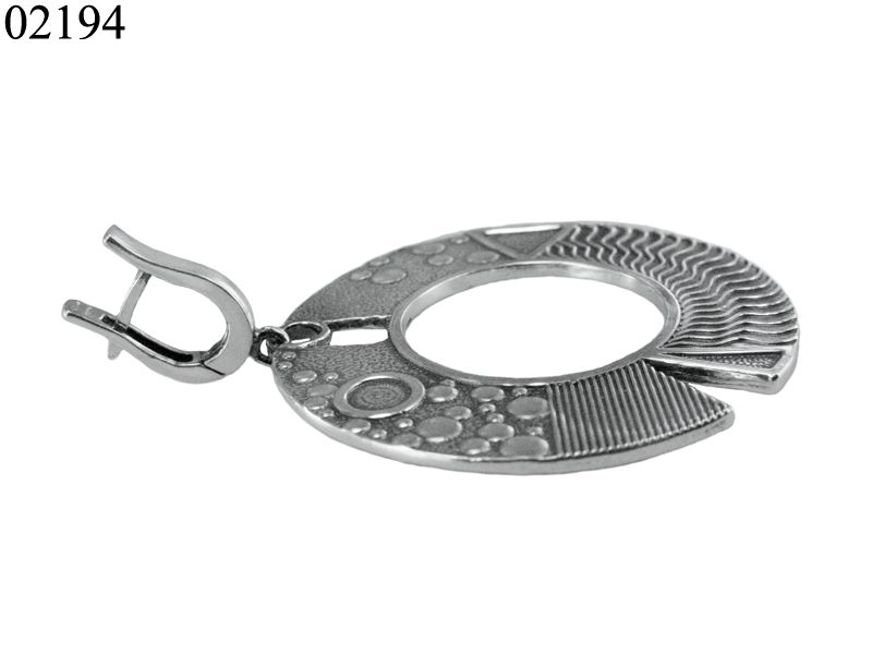 Серьги состоят из двух элементов – верхушка (замочек) и большой круг с отверстием по центру. Поверхность широкого ободка заполнена разными рисунками – ровными и волнистыми полосками, кружочками-каплями, треугольниками и т.д. Если у Вас бурная фантазия, Вы тоже рассмотрите в этой абстракции изображение рыбы под названием Фугу.