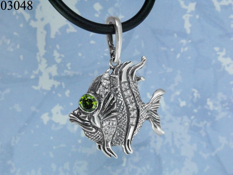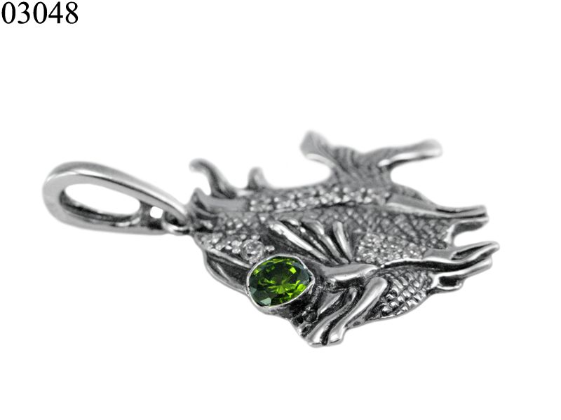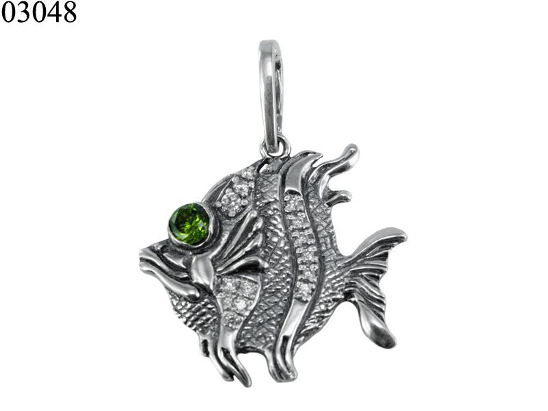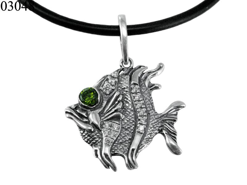 Элегантный подвес в виде рыбы, декорирован камнем кубический цирконий зеленого или другого цвета (уточняйте у менеджера магазина). Поверхность оксидированная.