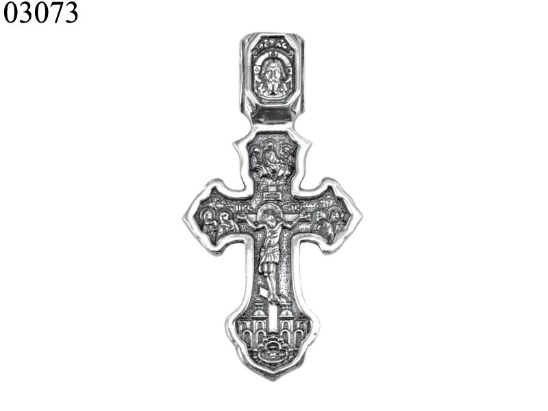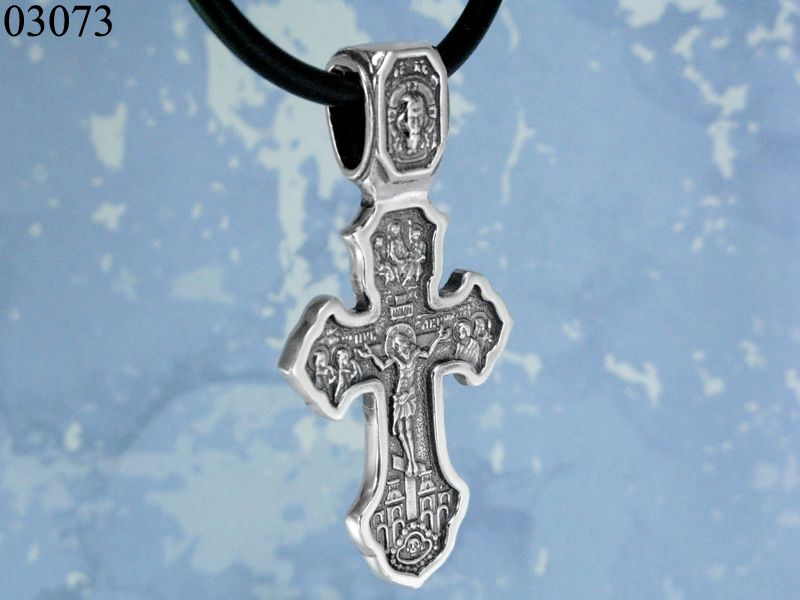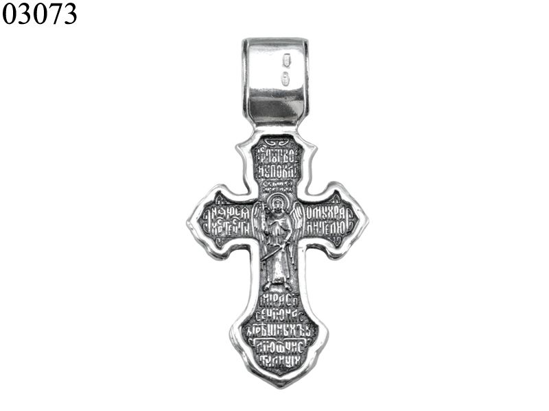Серебряный крест, достаточно массивный, поэтому больше подходит для мужчин. На лицевой стороне креста – распятие и лики святых, на обороте – Ангел Хранитель и молитва.