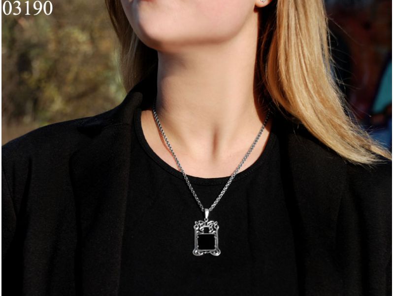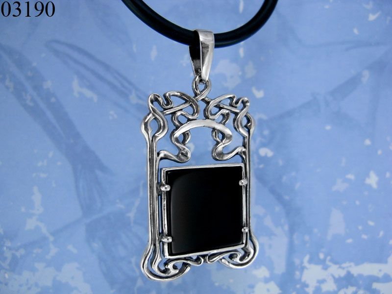 Подвес из серебра 925 пробы «Авангард» имеет условную форму прямоугольника. В центре «панно» - черный квадрат. Это плоский кабошон черного оникса. Поверхность натурального камня идеально гладкая и блестящая. Камень, словно картина «Черный Квадрат», взята в шикарную рамку из серебряного узора.