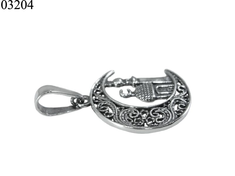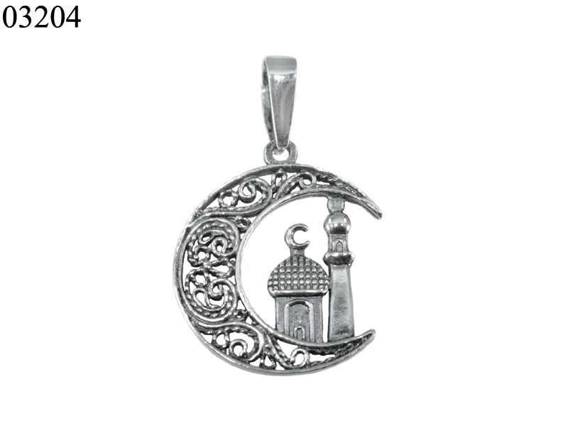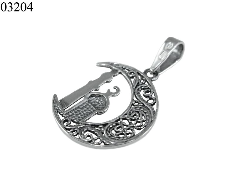 Новый кулон из серебра 925 пробы – «Мечеть с филигранью». Тонкая и изысканная работа, необычный дизайн. Полумесяц заполнен филигранными узорами, а сама мечеть изображена с четкой детализацией. Потрясающий кулон!