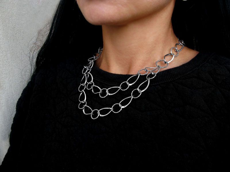 Главный тренд в ювелирном искусстве этого года – многослойность. Эта тенденция, по сути, никогда не выходит из моды, но в некоторые сезоны она особенно актуальна. Многослойность во всем – много браслетов на одной руке, несколько колец на одном пальце, две и больше сережки на одном ушке… И, как и сегодня, несколько цепей или других украшений в зоне декольте. Это могут быть две-три тонкие цепочки с разными кулонами. В данном случае цепи могут быть разного плетения и толщины. Это могут быть шнур с кулоном и поверх надетая цепь. Или же – колье с несколькими уровнями. Прекрасный пример – колье «Рок» из серебра 925 пробы.