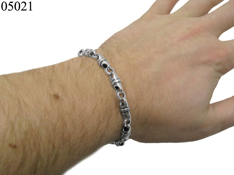 Этот браслет выполнен из элементов, которые напоминают гильзы, соединенные между собой плотными колечками. Каждый элемент внутри пустой. За счет этого браслет выглядит не тонким, а объемным.