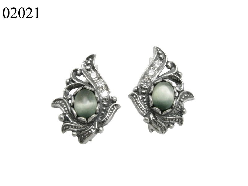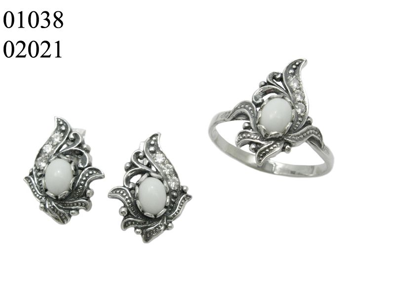 Серьги и кольцо декорированы интересным элементом, который напоминает пламя огня. По центру расположен овальный натуральный камень, а над ним сбоку – три круглых белых кубических циркония. Кроме камней, на основном декоре расположены мелкие и утонченные элементы – завитки и прорези, разнообразные шарики. Поверхность же полностью оксидированная.