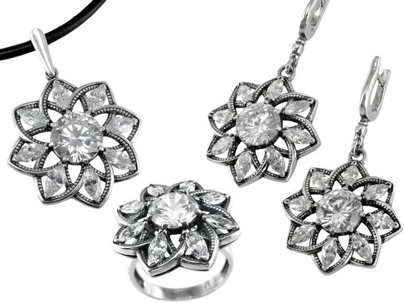 Неповторимый и яркий комплект из серебра с кубическим цирконием. Потрясающая огранка камней, дающая бриллиантовый блеск, качество работы и необычность формы! В комплект также можно подобрать браслет.
