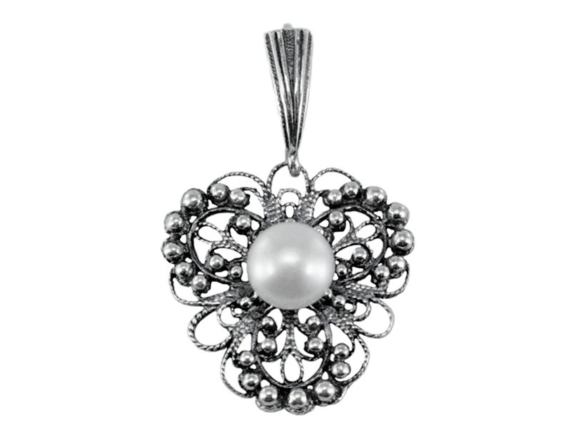 Изысканный комплект из серебра «Рассвет» с жемчугом. Весьма необычно, что комплект состоит из кулона и сережек. Размер этих изделий не маленький – это заметные изделия из серебра.