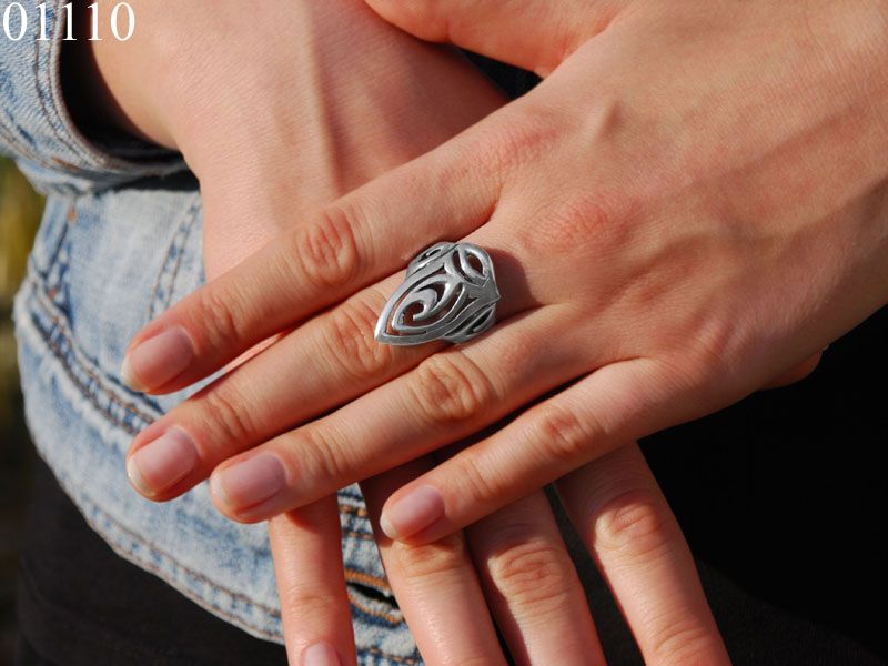 Серьги «Руны» длинные, напоминают мечи – острые к низу. Кольцо достаточно крупное и массивное. Прорезной узор повторяется на и на сережках, и на кольце.